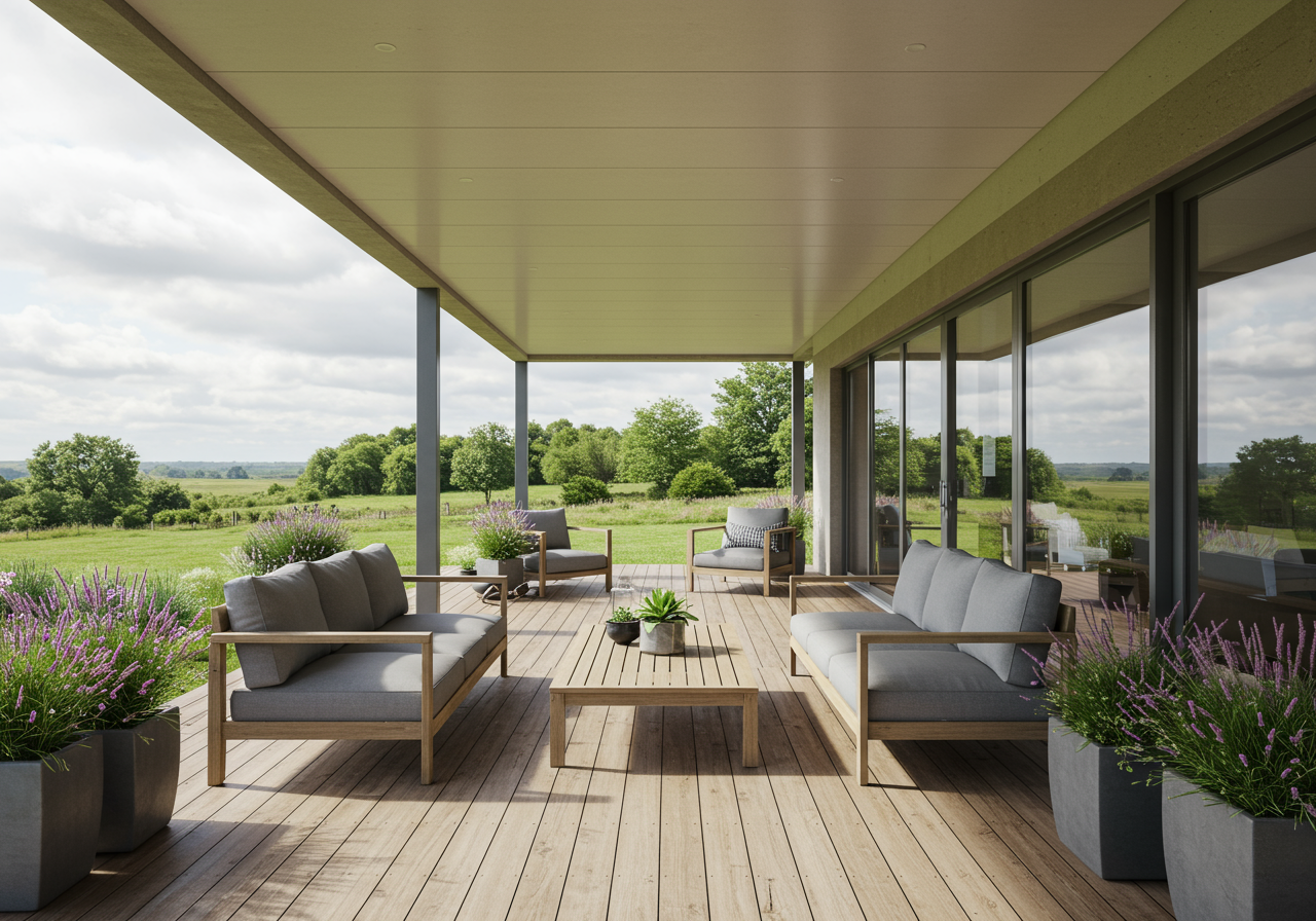 Like the door and entryway, visible seating can be an inviting amenity, whether placed in a courtyard or on a front porch. You may consider decorative rocking chairs for a smaller front porch or an entire patio set if you have space for a courtyard.