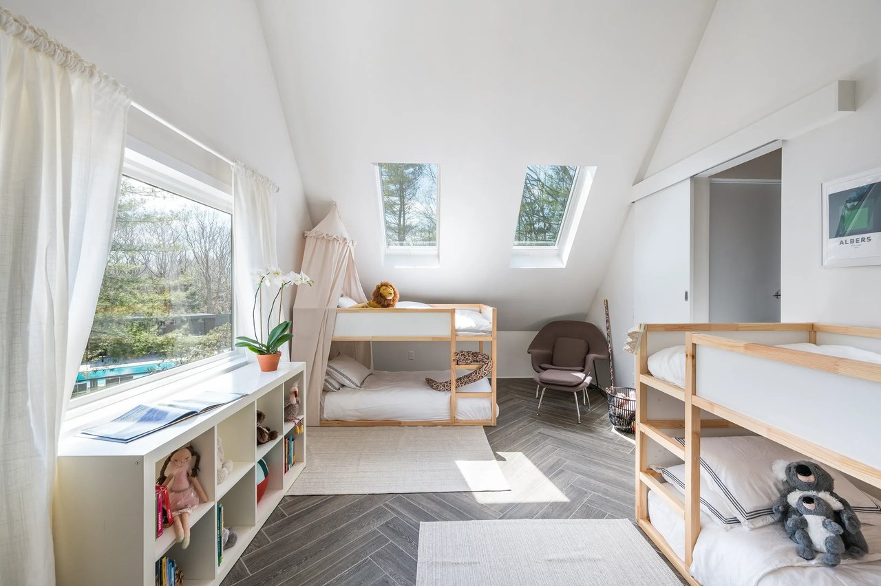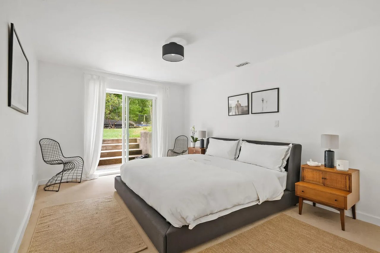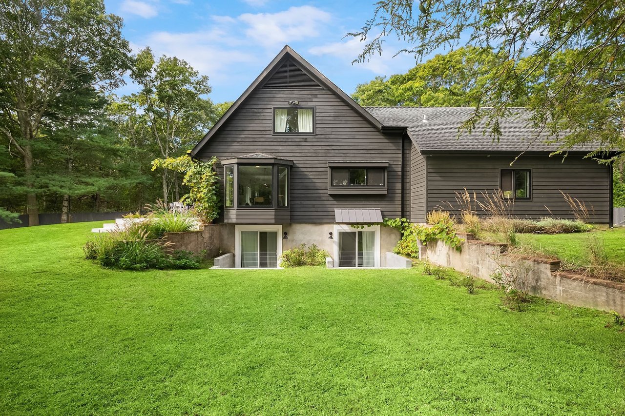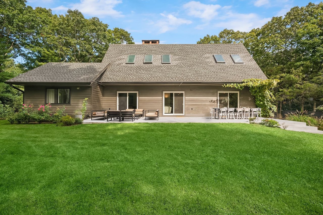 Serenely set at the end of a cul-de-sac, this contemporary design masterpiece awaits the next lucky summer tenant. The supremely private, fully fenced-acre flag lot is a stone's throw from East Hampton Village and the best beaches. The main house is a sprawling open floor plate contemporary that has been reimagined and renovated to the highest standards by a renowned architect and interior design team for modern luxury living at its best. Upon entering the home, you are welcomed by a sunny entry foyer with an entry hall closet and powder room. The open floor plan has excellent flow between the brand new kitchen, expansive dining room set for 12, living room with fireplace, and the main patio with three sliding doors for access. The kitchen is fully equipped with Bertazzoni Stainless steel appliances, sleek cabinetry, and gorgeous countertops/backsplash. There is a first-floor master bedroom with an en-suite five-fixture bathroom and walk-in closet, as well as a second en-suite bedroom with tons of storage. Head upstairs for the dramatic cathedral ceilings and abundance of natural light. The second- floor master is sprawling with 14-foot ceilings, five Velux oversized skylights, and tons of living space. Lie in bed and watch the moon travel across the dark night sky or take a luxury bath under the stars. The contemporary design of the master bath separates the five-fixture bathroom into bathing space and toilet space. In addition, there is another brand new full bathroom with exceptional tile work, high ceilings, and both tub and shower fixtures under yet another skylight. The second bedroom on this floor is used by the current owners as a kids' room with two bunk beds and an adjoining enormous play or study area. The lower level is mostly above grade with full ceiling heights and is a huge asset to the home. Two additional king-sized bedrooms both have direct garden access via individual private patios and sliding doors. There are two full bathrooms and a great second living room/screening room for casual entertaining. There is also a gym room, wine cellar, Laundry room with a slop sink and freezer. The home is replete with a full house water filtration system with UV light and all materials are eco-friendly including reclaimed materials, no VOC paints, and stains. The crown jewel of this home is the grounds and the pool entertaining space, which are a midsummer's dream. There is a full playground for children outside of the securely fenced pool area. A full kitchen awaits the barbecue enthusiast including Napoleon LP BBQ and two burner range, outdoor fireplace, a professional pizza oven, a full entertaining patio T.V and dining set for 12, as well as two pool houses which offer all the modern conveniences desired. This is a must-see home for a very special summer stay. Full-season tenants are preferred. Pet Friendly. Broker owner.
