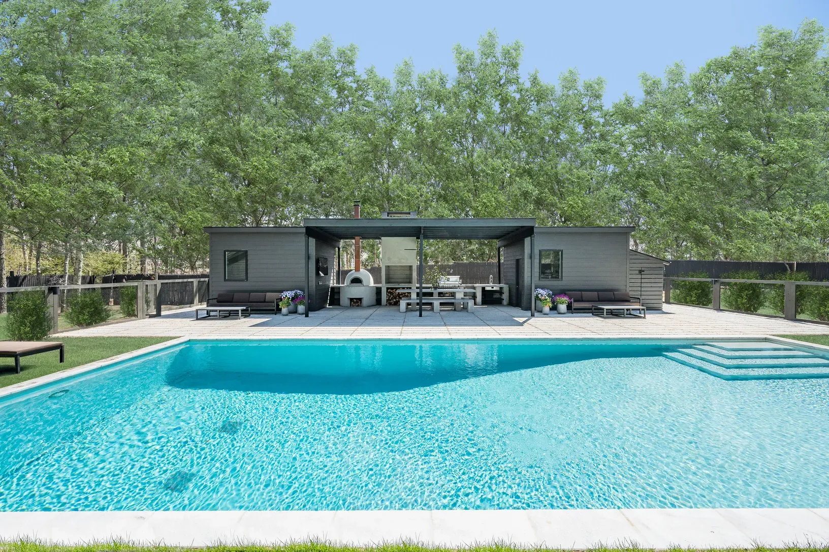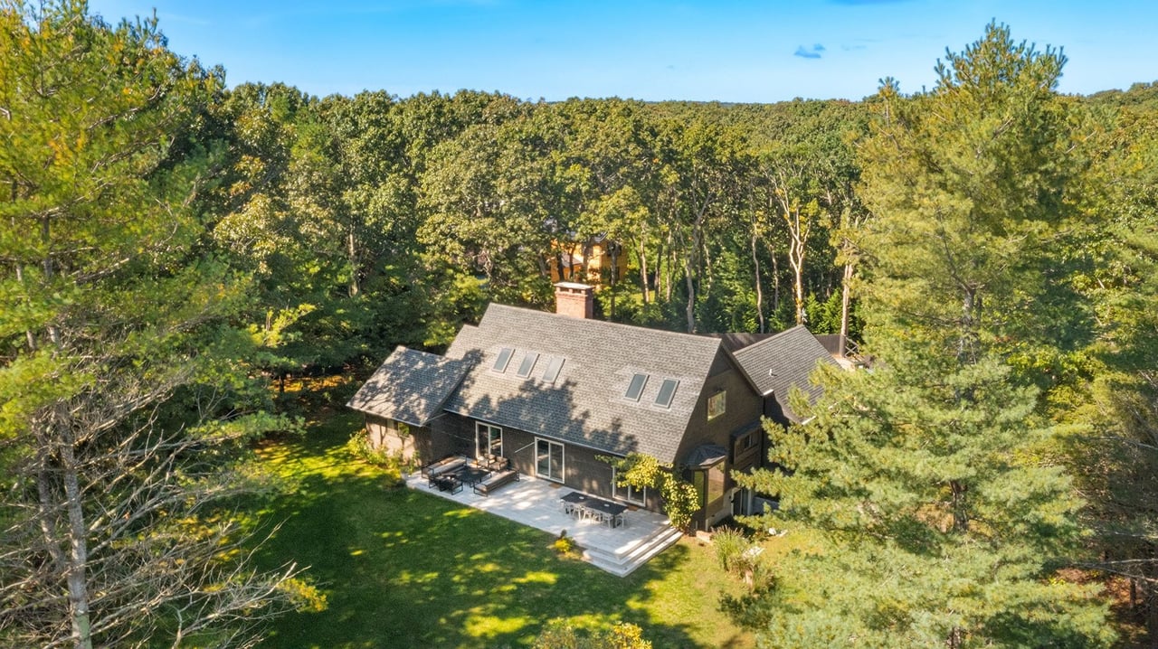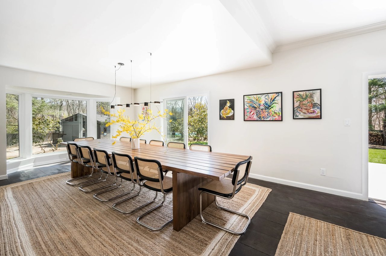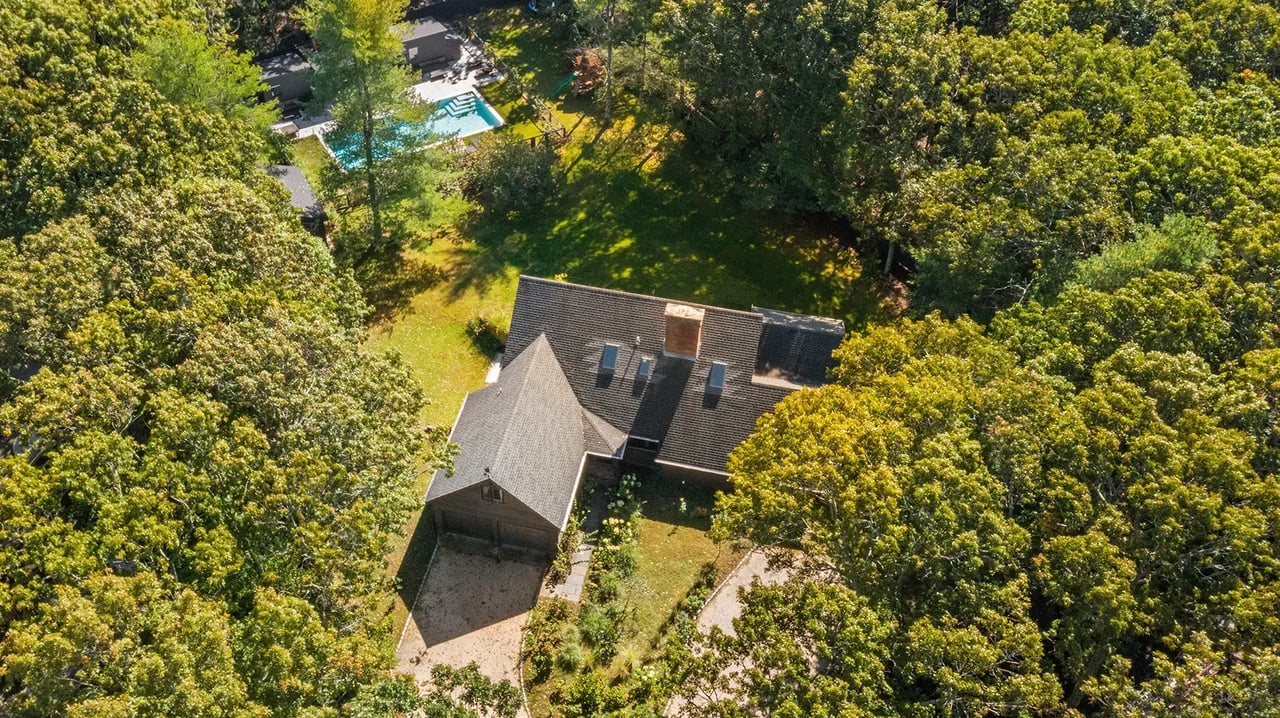 Serenely set at the end of a cul-de-sac, this contemporary design masterpiece awaits the next lucky summer tenant. The supremely private, fully fenced-acre flag lot is a stone's throw from East Hampton Village and the best beaches. The main house is a sprawling open floor plate contemporary that has been reimagined and renovated to the highest standards by a renowned architect and interior design team for modern luxury living at its best. Upon entering the home, you are welcomed by a sunny entry foyer with an entry hall closet and powder room. The open floor plan has excellent flow between the brand new kitchen, expansive dining room set for 12, living room with fireplace, and the main patio with three sliding doors for access. The kitchen is fully equipped with Bertazzoni Stainless steel appliances, sleek cabinetry, and gorgeous countertops/backsplash. There is a first-floor master bedroom with an en-suite five-fixture bathroom and walk-in closet, as well as a second en-suite bedroom with tons of storage. Head upstairs for the dramatic cathedral ceilings and abundance of natural light. The second- floor master is sprawling with 14-foot ceilings, five Velux oversized skylights, and tons of living space. Lie in bed and watch the moon travel across the dark night sky or take a luxury bath under the stars. The contemporary design of the master bath separates the five-fixture bathroom into bathing space and toilet space. In addition, there is another brand new full bathroom with exceptional tile work, high ceilings, and both tub and shower fixtures under yet another skylight. The second bedroom on this floor is used by the current owners as a kids' room with two bunk beds and an adjoining enormous play or study area. The lower level is mostly above grade with full ceiling heights and is a huge asset to the home. Two additional king-sized bedrooms both have direct garden access via individual private patios and sliding doors. There are two full bathrooms and a great second living room/screening room for casual entertaining. There is also a gym room, wine cellar, Laundry room with a slop sink and freezer. The home is replete with a full house water filtration system with UV light and all materials are eco-friendly including reclaimed materials, no VOC paints, and stains. The crown jewel of this home is the grounds and the pool entertaining space, which are a midsummer's dream. There is a full playground for children outside of the securely fenced pool area. A full kitchen awaits the barbecue enthusiast including Napoleon LP BBQ and two burner range, outdoor fireplace, a professional pizza oven, a full entertaining patio T.V and dining set for 12, as well as two pool houses which offer all the modern conveniences desired. This is a must-see home for a very special summer stay. Full-season tenants are preferred. Pet Friendly. Broker owner.