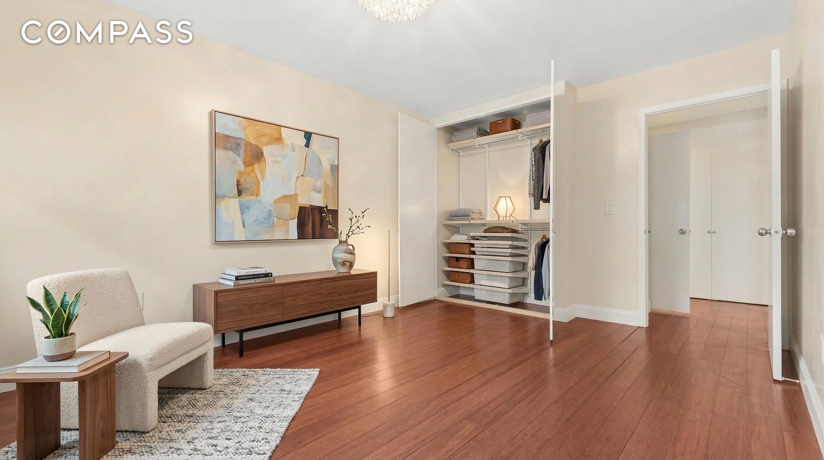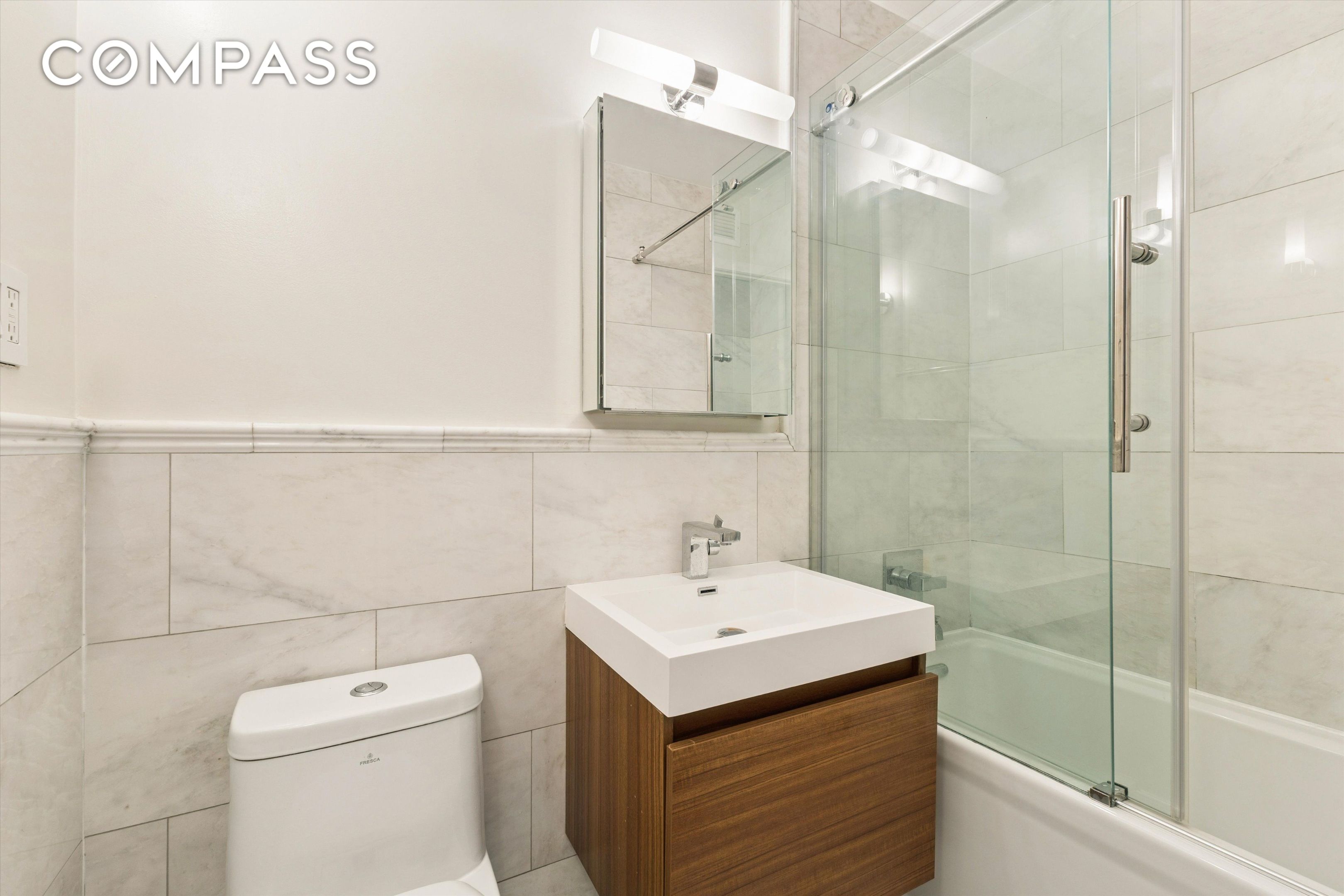 The apartment features a modern open kitchen with new stainless steel appliances and counter seating for casual dining, with ample space to accommodate a full dining area. The all-new bathroom offers a deep soaking tub and clean contemporary finishes, while wood flooring, stylized lighting, and custom closet build-outs add both warmth and functionality throughout. The home enjoys lovely natural light with northern exposure, creating a bright and inviting atmosphere.