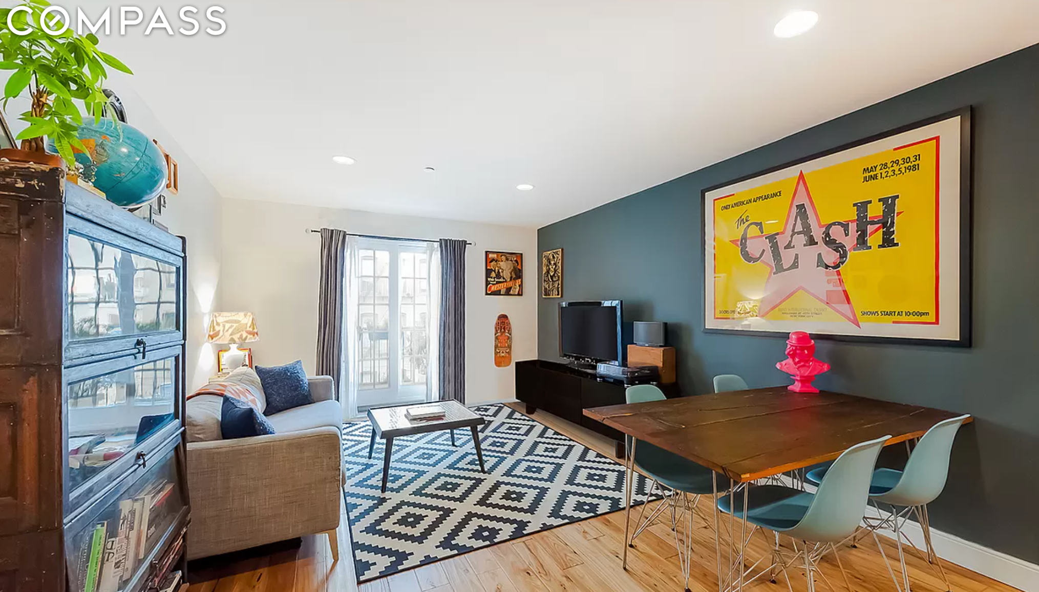 The home features unique reclaimed barn wood floors throughout, as well as a balcony with Long Island City views. It is just one block from the G train and is in close proximity to the area's restaurants and shops. The building amenities include a virtual doorman system, storage, a laundry room, a bike room, and a roof deck. Pets are allowed upon approval.