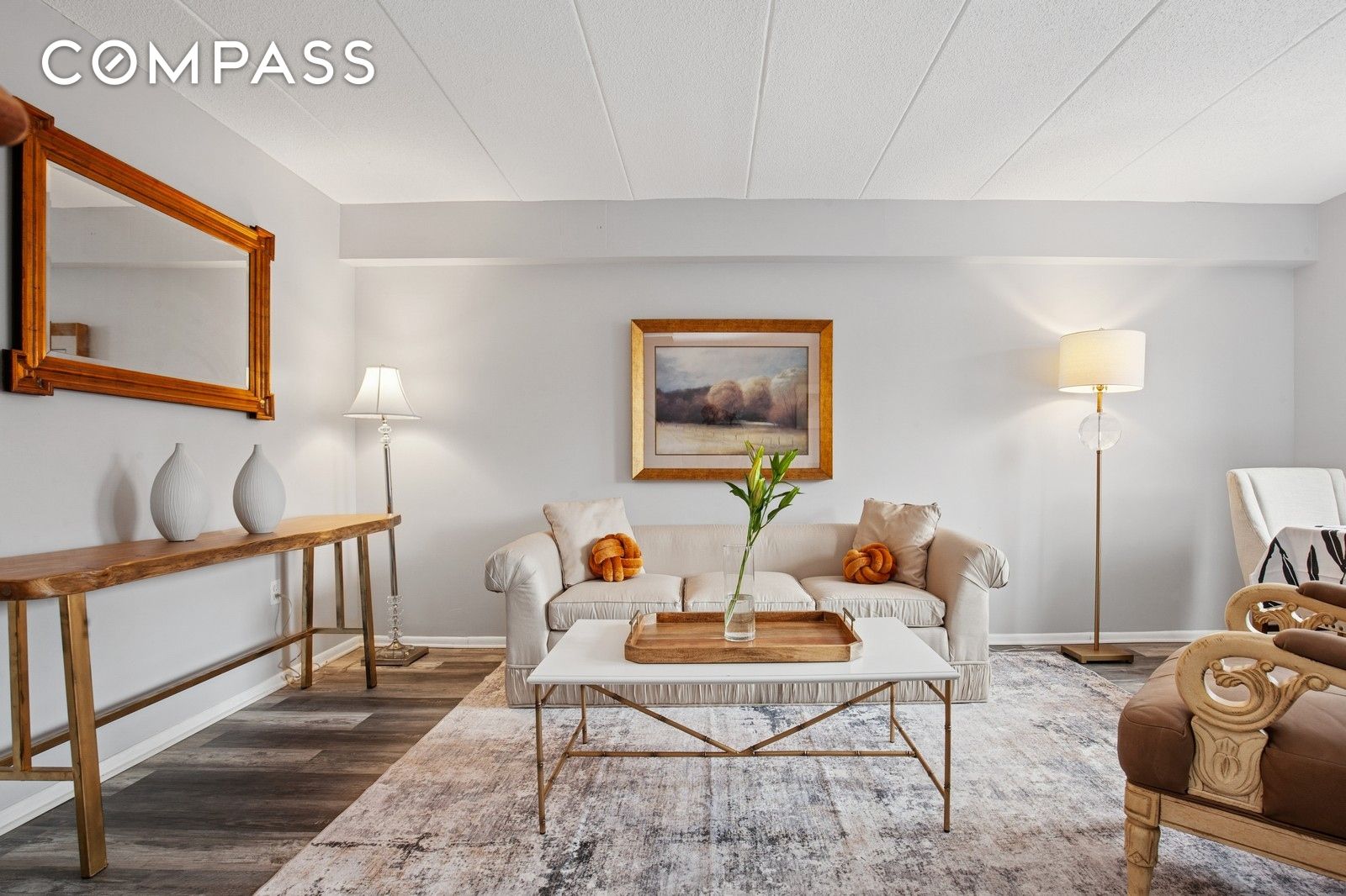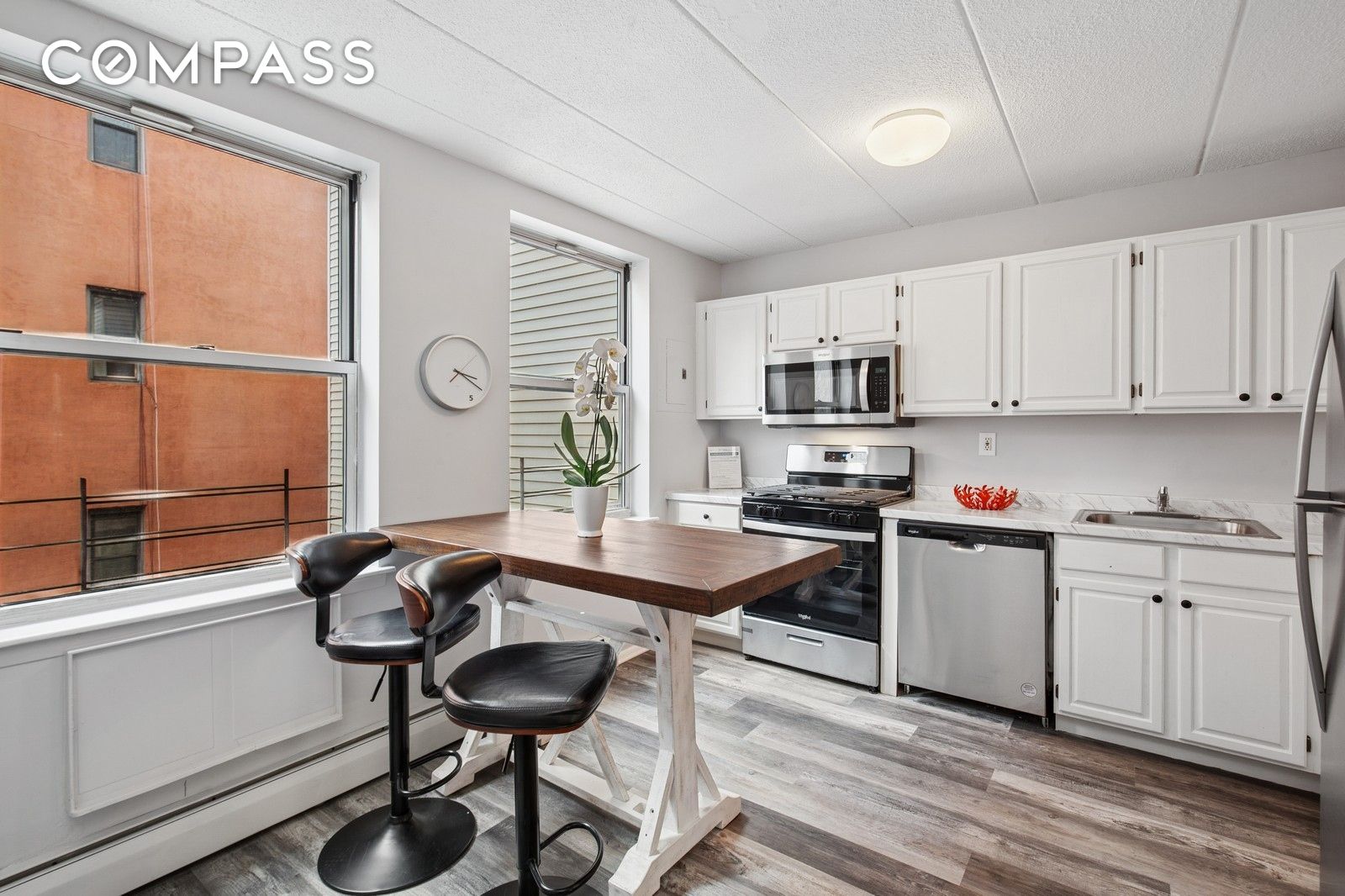 The spacious living room is filled with natural light from east-west exposures, creating the perfect setting for both sunrise and sunset views. A windowed eat-in kitchen has been renovated with brand-new stainless steel appliances, sleek cabinetry, and stylish finishes. Both bathrooms have been refreshed to complement the freshly painted walls and all-new flooring throughout the home. Ample closet space ensures effortless storage.