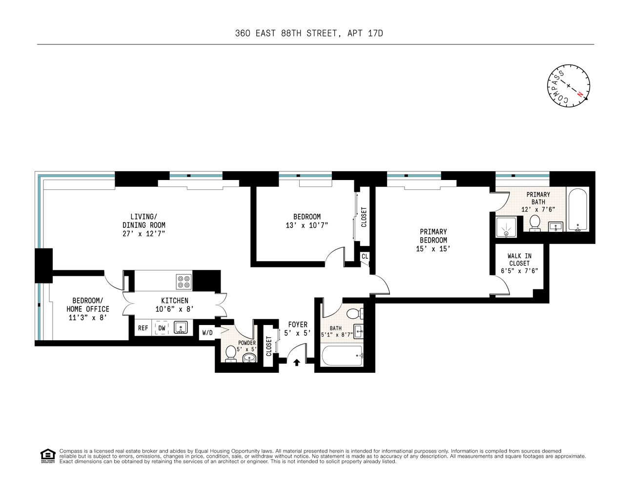 The well-equipped home boasts spectacular open city views and oversized windows in every room, an open kitchen, high ceilings, beautiful herringbone floors, great closet space, and a washer/dryer. The layout is ideal, with a generous foyer, hall powder room with w/d, and open kitchen to the living-dining room. Currently set up a flex 3 bedroom, the home can also be returned to its original 2 bedrooms with dining alcove configuration. The bedrooms have southern exposure and their own dedicated full bathrooms. The master is very large with an en suite bathroom and walk-in closet. Central air and heat throughout and lots of storage.