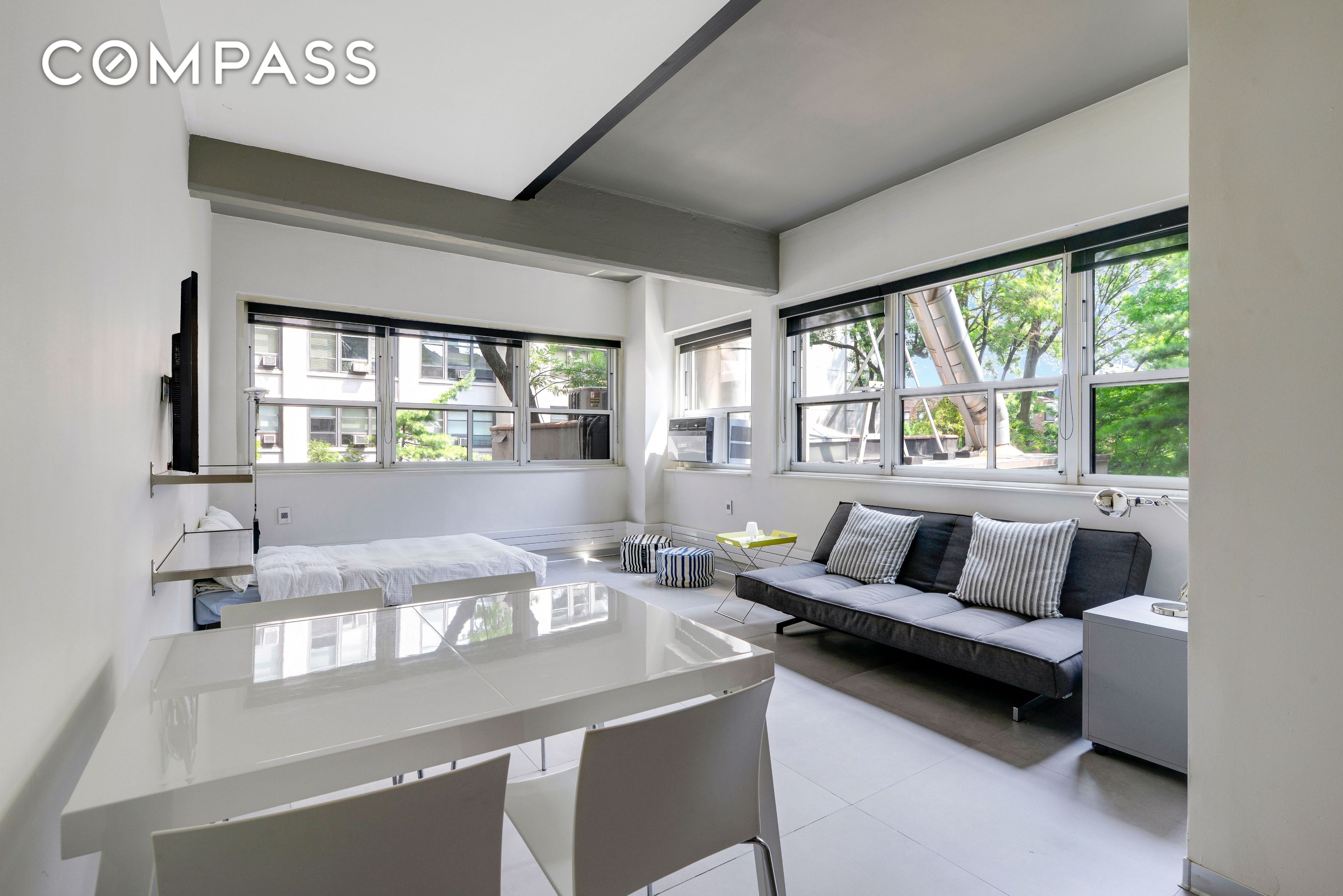 Step into a bright and airy condo with soaring ceiling and a welcoming open-concept living and dining area that invites natural light to flood the space. Perfect for entertaining guests or enjoying a quiet evening in, this layout ensures every inch of space is utilized to its fullest potential. Sleek and stylish kitchen, complete with stainless steel appliances, ample cabinet space. The apartment boasts high-quality finishes, that create a clean, modern aesthetic, while an exposed concrete column adds an industrial touch, setting a trendy yet cozy tone throughout the home. The storage space is exceptional with many outfitted closets that go full ceiling height.